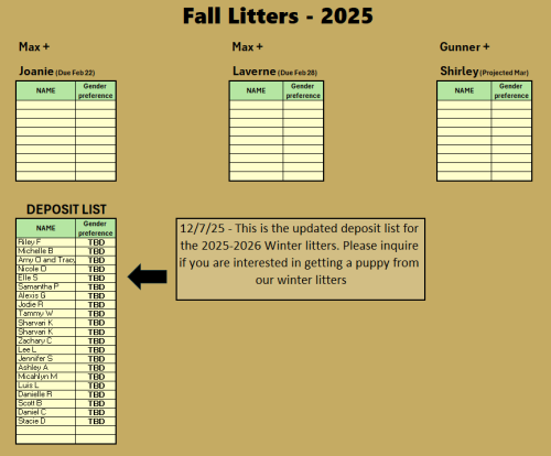 Gunner x Shirley – Anticipated due date: March, 2026. Not accepting deposits at this time.
