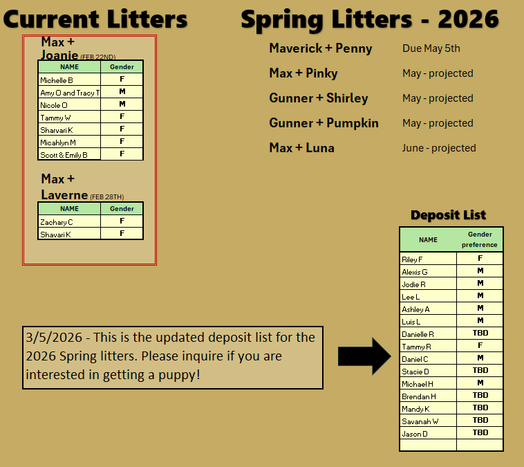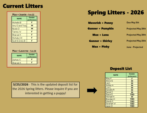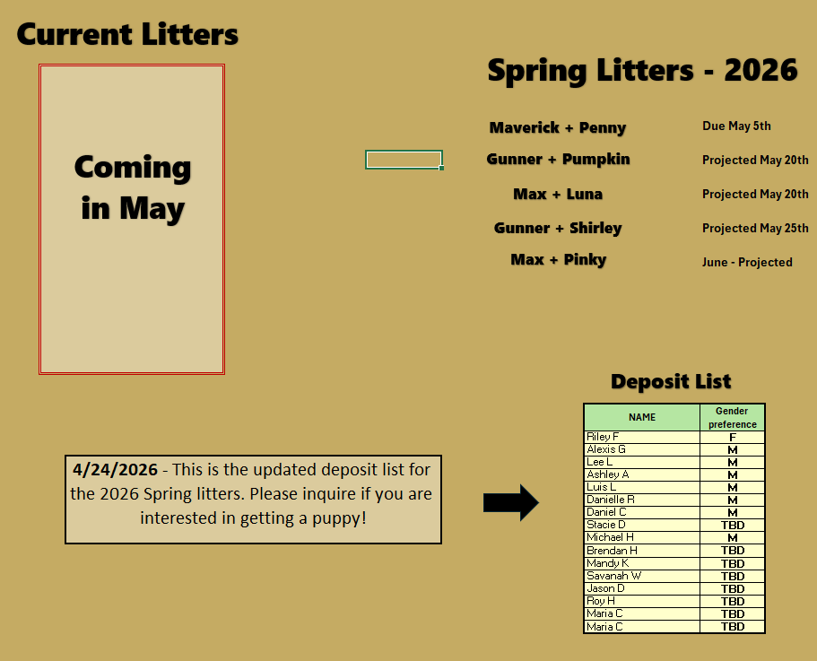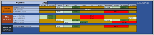This is a “best guess” scenario of upcoming litters for 2026, updated 3/5/2026.